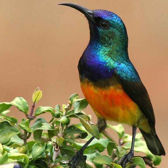 A moment later, there is a tiny, brightly-colored passerine perched on the edge of the bar, barely larger than a hummingbird. To be specific, it is a Variable Sunbird, its upper body awash with iridescent - almost metallic - greens and blues, dark greeny-brown wings and tail, and a yellow underbody smudged with fiery orange.