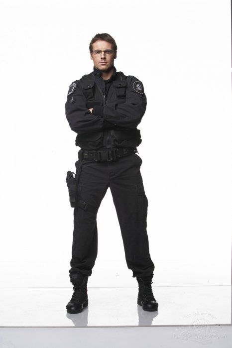 He's wearing black BDU's, that have SG1 and SGC patches on the shoulders and a black vest.