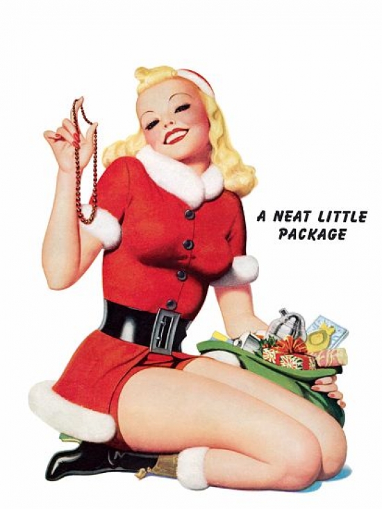 When she re-appears, she looks a little different: her black jeans and jacket have been replaced by a very brief Mrs. Claus minidress, complete with Santa hat and polished black boots. She sits on the bartop and pushes herself over, then gives the polished surface a fond pat.